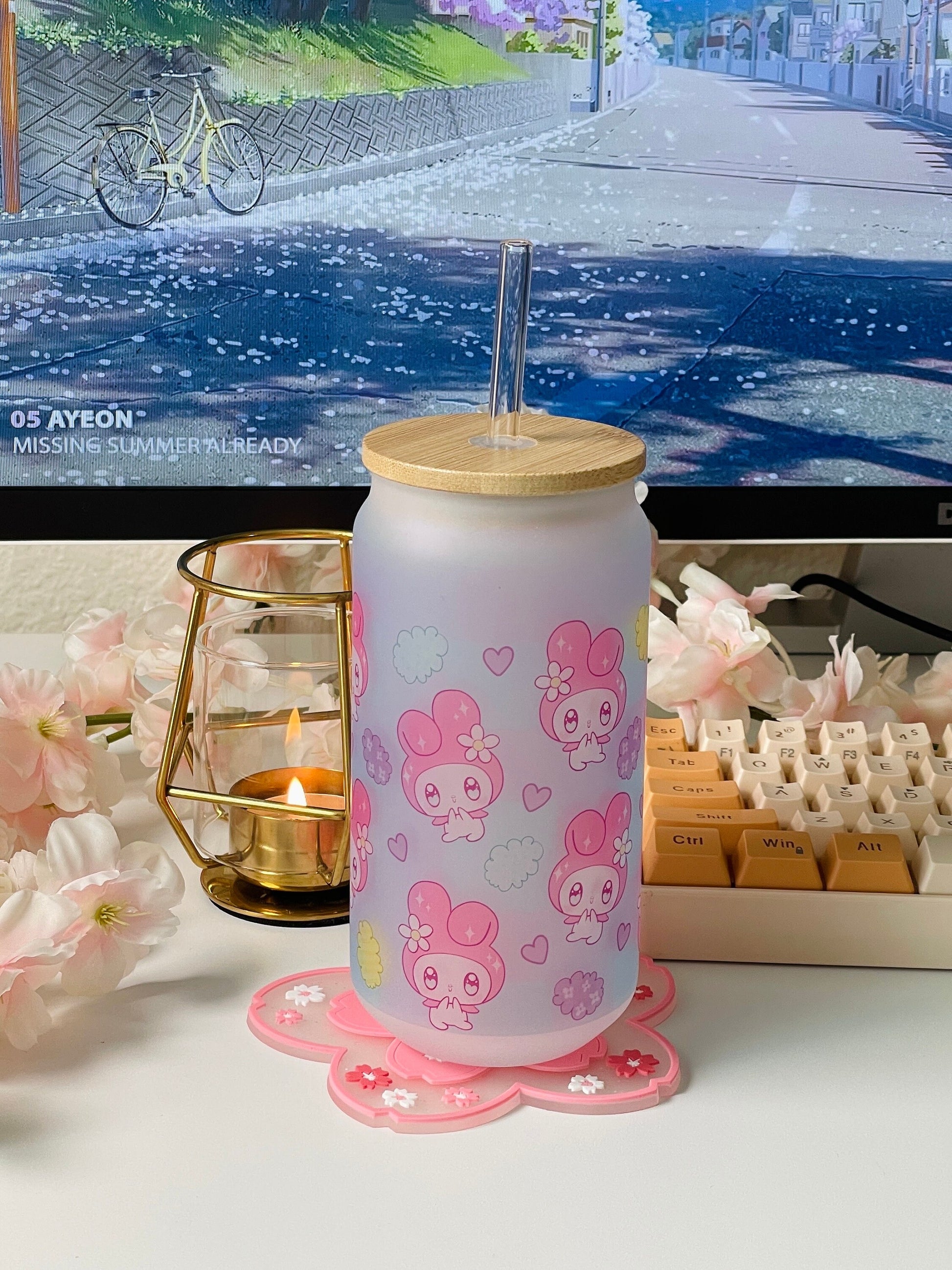 Cute bunny glass, with a cute rainbow candy clouds background, pink bunny cup, Iced Coffee Glass, Glass Can with Bamboo Lid and glass straw